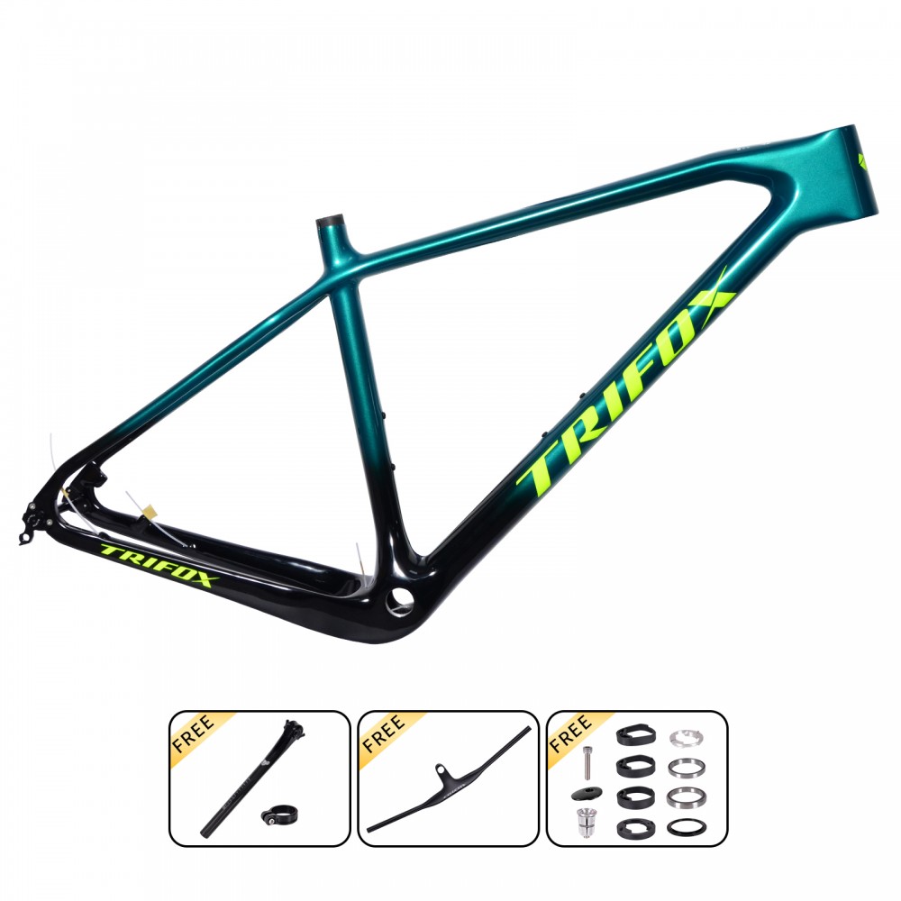 | Package Content | 1 x Carbon MTB Frame 1 x Carbon MTB Seatpost 1 x Integrated Riser Bar 1 x Seatpost Clamp 1 x Thru Axle Skewer (142TA / 148TA) 1 x Headset 1 set of Rear Derailleur Hanger 1 x Derailleur Hanger Protector |